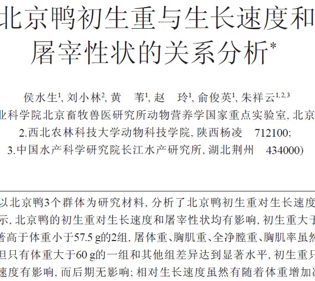 “北京鴨初生重與生長速度和屠宰性狀相關分析”有助于提供北京烤鴨的鴨子。