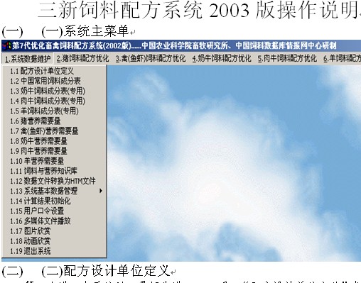 內容介紹:三新飼料配方系統2003版操作說明 (一)系統主菜單 (二)配方設計單位定義