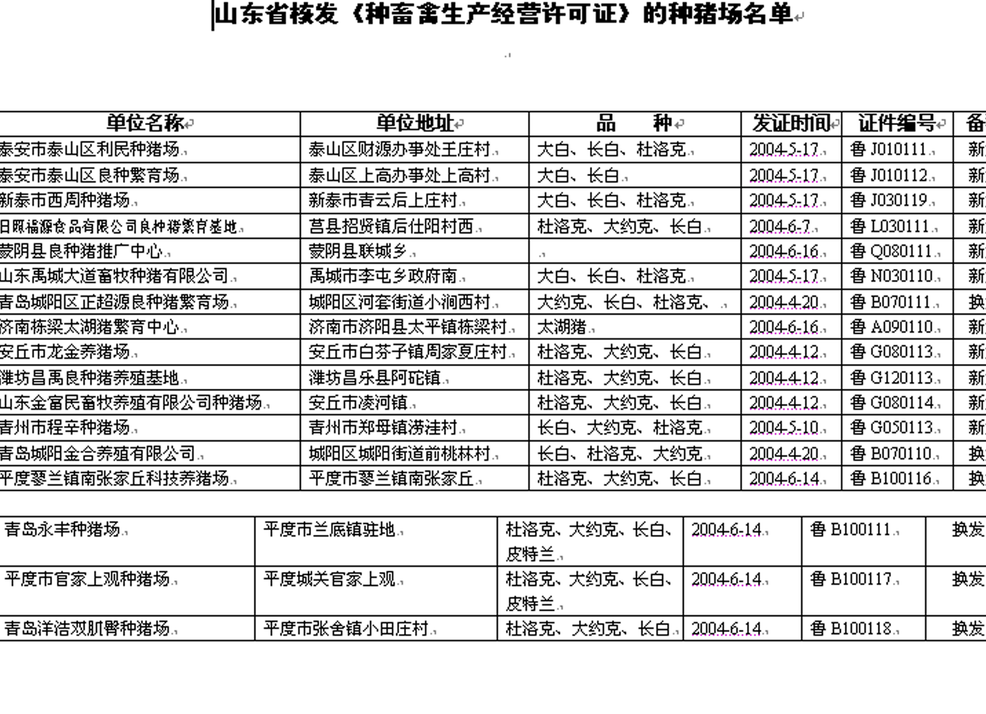 山東省核發《種畜禽生產經營許可證》的種豬場名單
